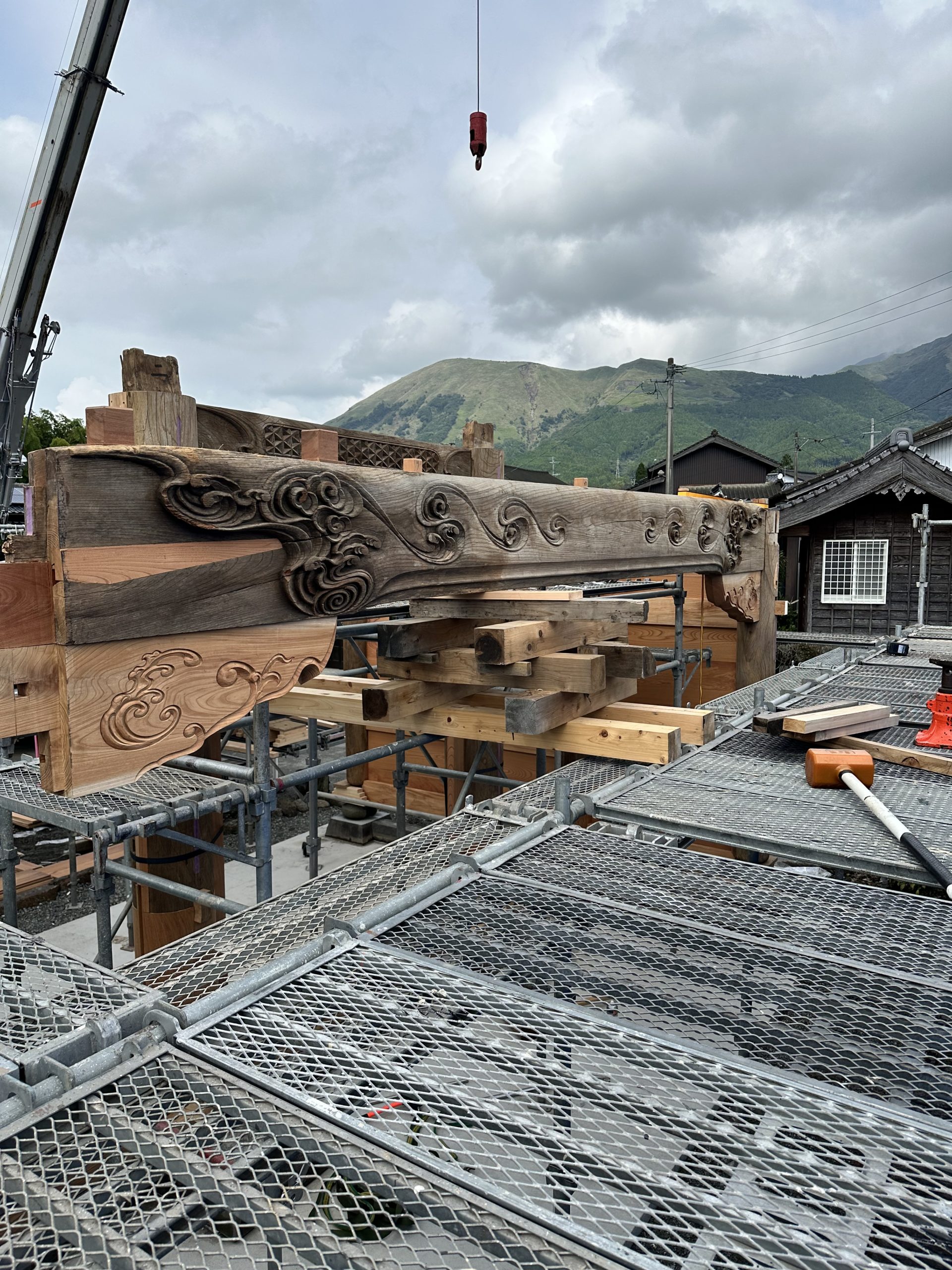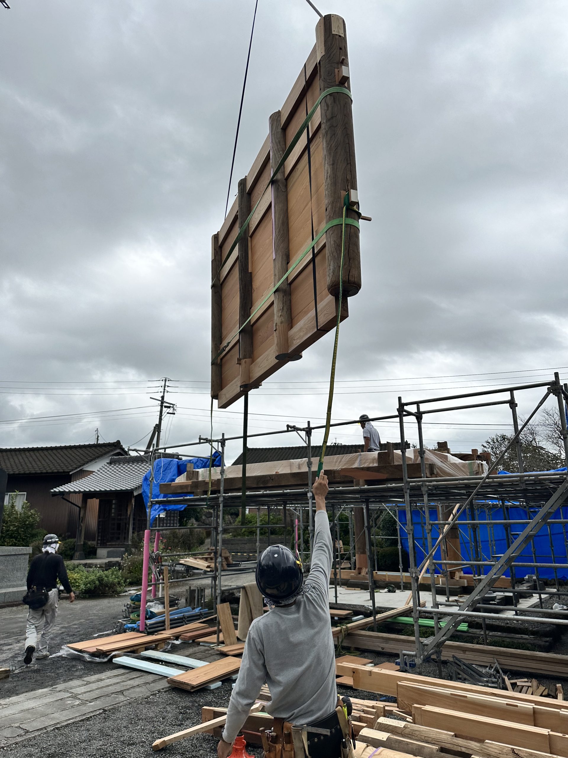いよいよ明和四年建立の浄土真宗本願寺派玉泉山 正教寺様の楼門再建工事の建て方始まりました。熊本地震から9年目を迎えた令和7年10月正教寺様の境内に258年前の姿を取り戻すべく、正教寺様からのご縁をいただいた「木匠・井元建築」棟梁を筆頭に職人一丸となって取り組んできた集大成の日を迎える事が出来た事に感謝いたします。建て方前にご住職よりお経を唱えていただき安全祈願をしていただき、ありがとうございます。ご住職、檀家様に見守られる中いよいよ作業開始です。まずは本柱を建て込み、管柱に胴板、貫をはめ込み組み込んでいきクレーンで吊り上げ建て込んでいきます。