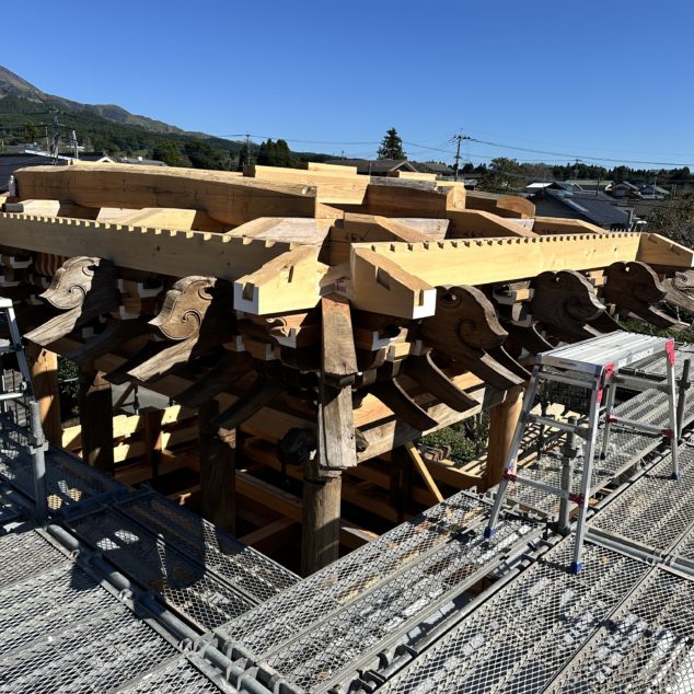 熊本県宇土市新開町の浄土真宗光蓮寺様の屋根替え・本堂口虹梁差し替え工事を上村瓦さんと共に施工させていただきます。長年の雨漏りで傷んだ屋根と白蟻被害を受けた本堂口虹梁の差し替えを施工していきます。上村瓦さんが瓦を降ろした後屋根の腐食部分を交換・調整を行なっていきます。既存の大破風は元々漆喰が塗ってあり以前の改修工事で板金巻きとなっておりましたが、今回の改修工事で大破風の交換もさせていただきました。取り外した大破風を工場へ、採寸、型取りをし新たな桧の大破風へと交換していきます。今回ご縁をいただいた光蓮寺様に感謝し心を込めて施工させていただきます。