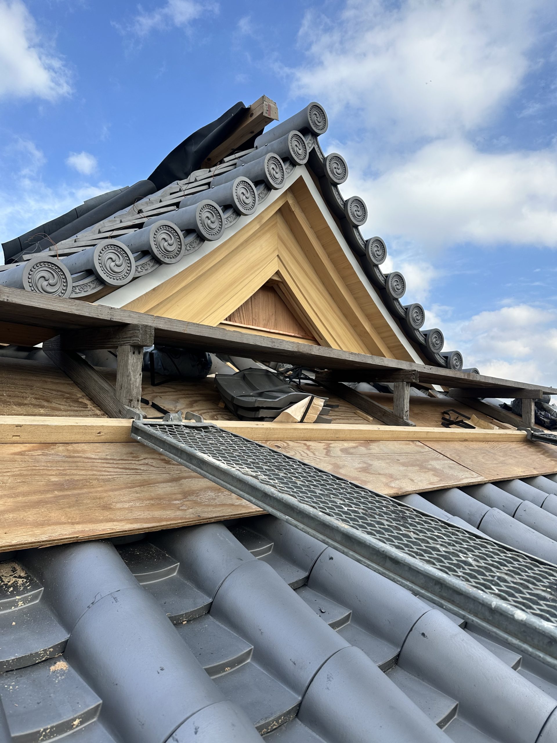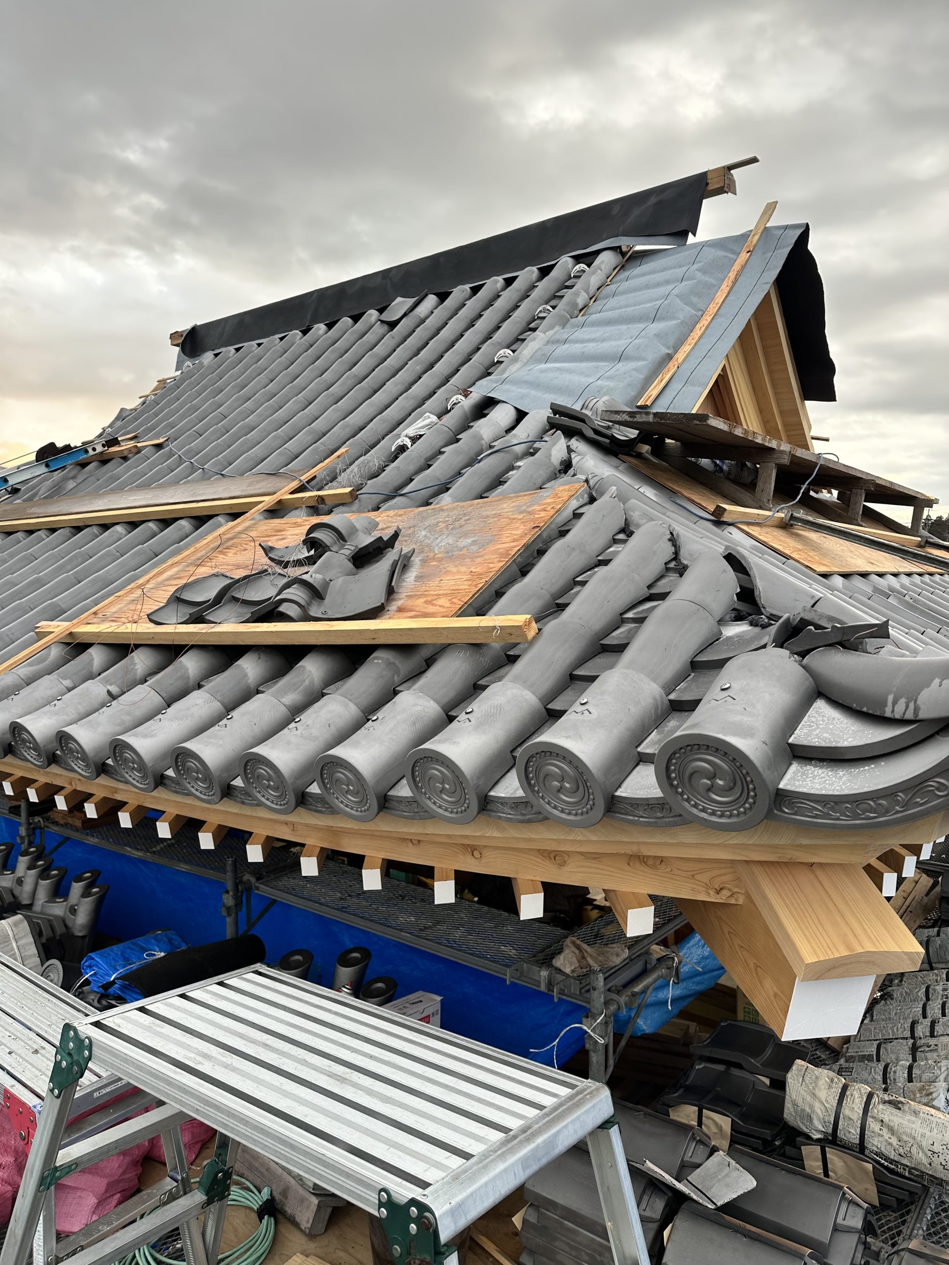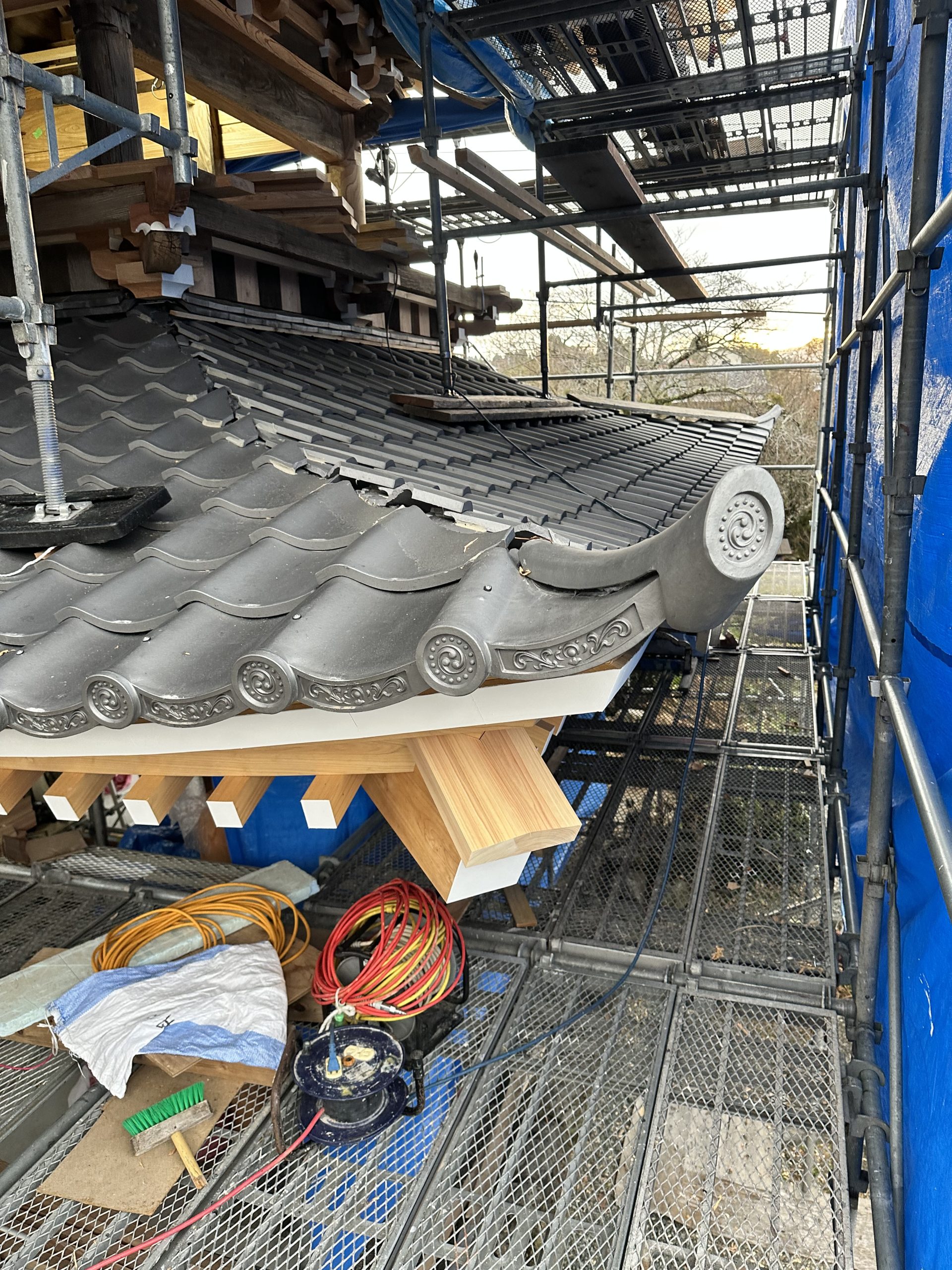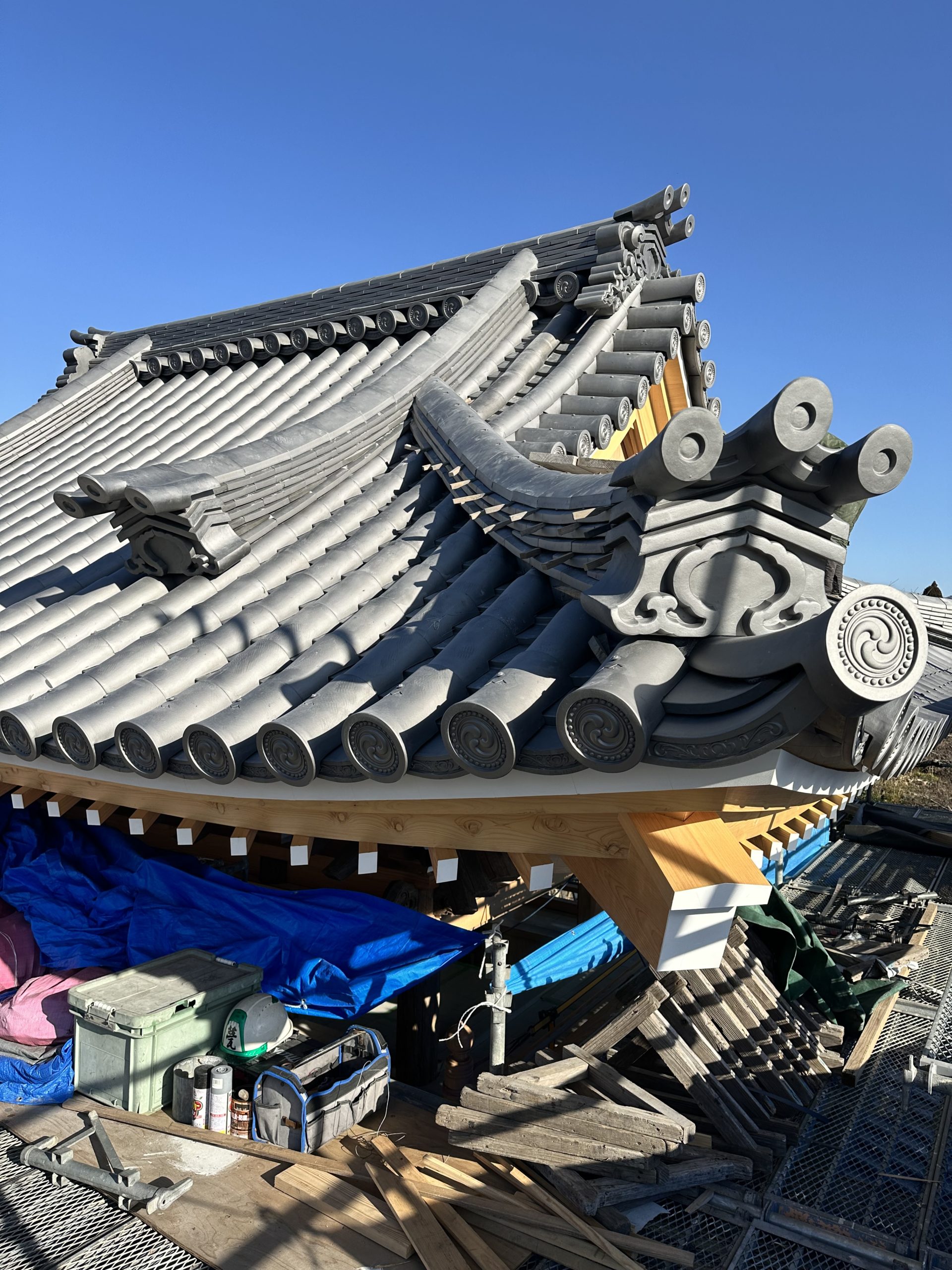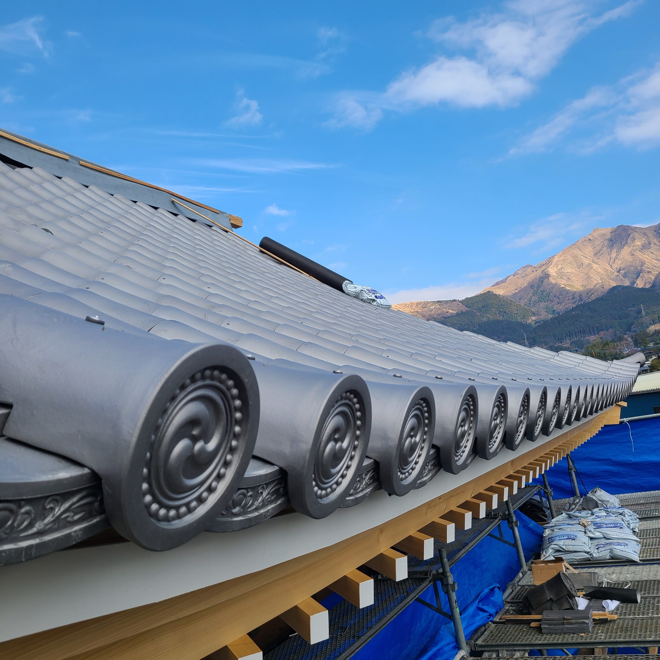 現場の方では(有)林田瓦店の瓦工事も順調に進んでおり匠の技で瓦の施工を行ってもらっています。一層目屋根は和型で収め二層目屋根は一体型準本葺瓦で施工していきます。本棟・降り棟・隅棟のノシ瓦は反りノシ瓦を使用し施工しますので技術はいりますが、そこは信頼できる林田瓦店、匠の技で見事に施工していきます。現場は山からの吹きおろしの風が冷たいですが安全第一作業のほうよろしくお願いします。