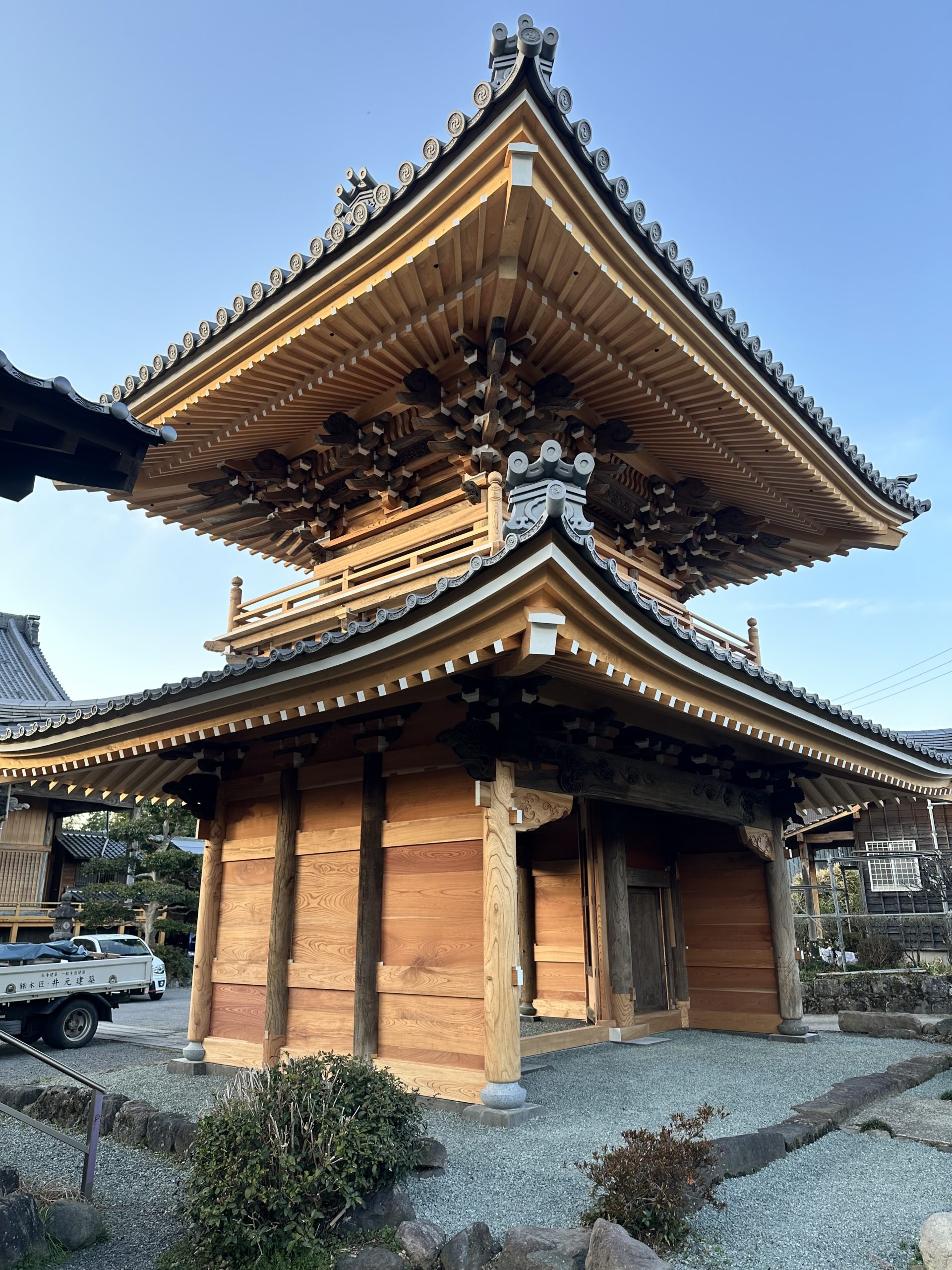 2023年8月に正教寺の様材料保管庫から部材を作業場のほうへと移動して約二年半いよいよ脇扉と唐戸の取り付けを残すところとなり、原寸起こしから約三年、2016年の熊本地震から10年目の2026年に正教寺様の楼門を完成させることができました。これもご住職はじめお寺の方々、檀信徒の皆様の楼門を再建したいと想う熱い気持ち、行動で(株)木匠・井元建築がご縁をいただき楼門を再建工事を手掛けさせていただき感謝いたします。江戸中期の明和四年に建立され長きにわたり境内にて歴史の移り変わりを見続けていた正教寺様楼門、熊本地震により一度は倒壊し十年という空白の期間はありましたがまた再び正教寺様境内にて何百年と歴史の移り変わりを見続けてほしいという想いも込めて施工させていただきました。楼門を再建工事に携わり先人の大工さんの技術には勉強させられること考えさせられること等色々ありましたが本当に貴重な体験をさせていただきました。改めて正教寺様楼門再建工事に関わった方々に感謝いたします。